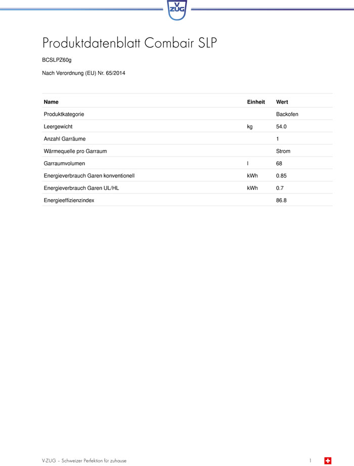 VZug Combair SLP, Einbau Back-Ofen Spiegelglas, BCSLPZ60g, 2102260002