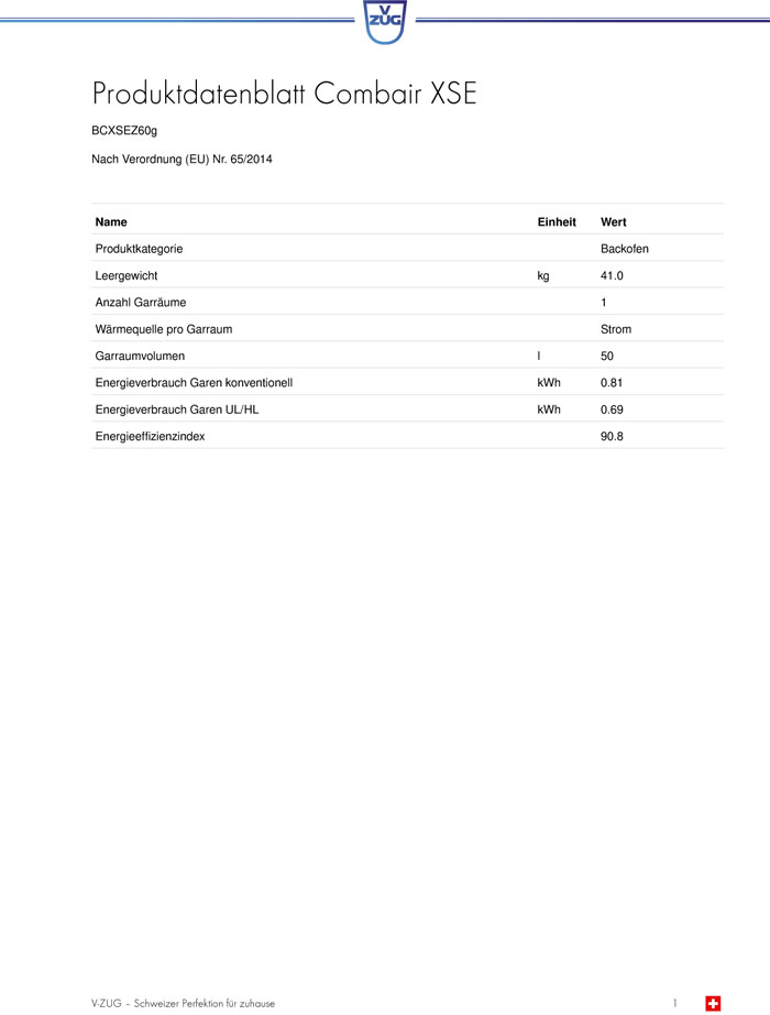 VZug Combair XSE, Einbau Back-Ofen Spiegelglas, BCXSEZ60g, 2101760002
