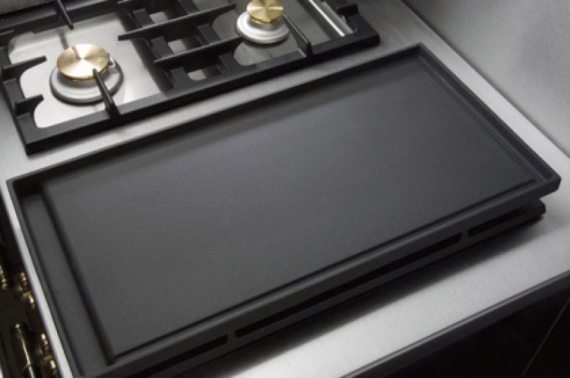 Emaillierte Gussplatte wird auf den Rost der zwei seitlichen Gasbrenner gelegt