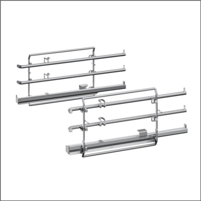 Mit diesem pyrolysefesten Teleskopauszug können Sie nicht nur Ihr Backblech vollständig aus dem Backofen herausziehen, sondern es auch bequem und sicher seitlich aus den Schienen heben. Alle Auszüge können auf beliebigen Ebenen frei positioniert werden.