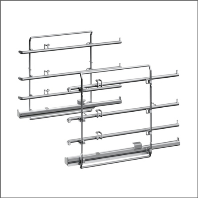 Mit diesem pyrolysefesten Teleskopauszug können Sie nicht nur Ihr Backblech vollständig aus dem Backofen herausziehen, sondern es auch bequem und sicher seitlich aus den Schienen heben. Alle Auszüge können auf beliebigen Ebenen frei positioniert werden.