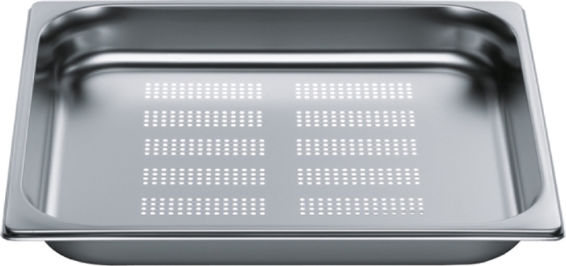 Garbehälter aus pflegeleichtem Chromstahl. Zum Garen von Gemüse oder zum Auftauen von Tiefgefrorenem. Überschüssige Flüssigkeit und Saft fliesst durch die Löcher ab. Es wird die Kombination mit einem ungelochten Garbehälter empfohlen, um der Verschmutzung im Garraum vorzubeugen und das Reinigen zu erleichtern.