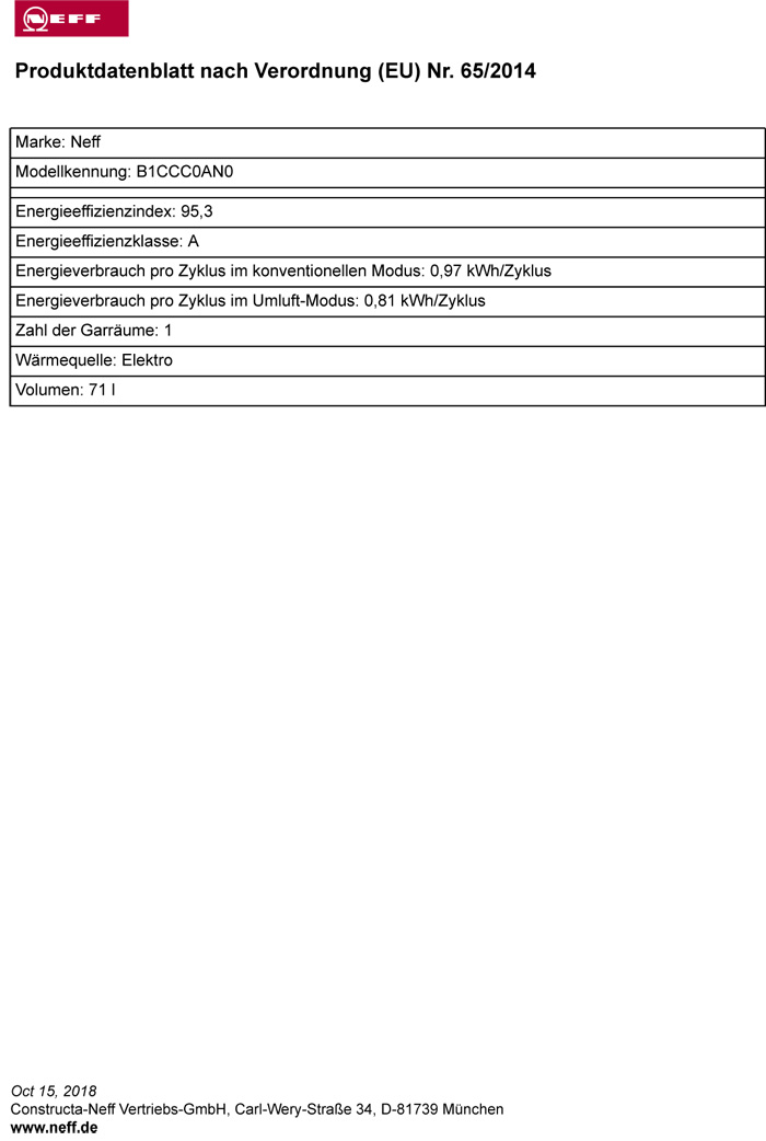 • Energieeffizienzklasse (gem. EU Nr. 65/2014): A (auf einer Energieeffizienzklassen-Skala von A+++ bis D)
