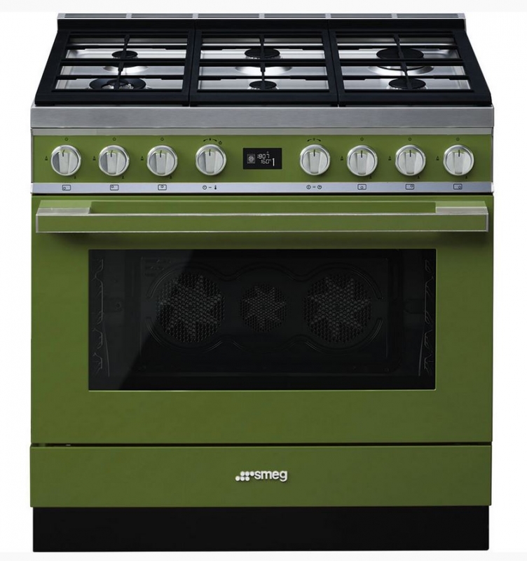 SMEG CPF9GPOGD , Portofino-Kochzentrum, Olivgrün, 90 cm, Gaskochmulde, Backofen Multifunktion, 10 Beheizungsarten, 20 Automatikprogramme, Turbo-/Dreifach-Heissluft, Energieeffizienzklasse A+