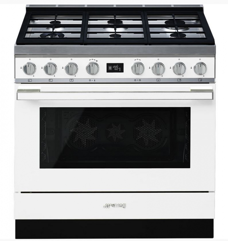 SMEG CPF9GPWHD, Portofino-Kochzentrum, Weiß, 90 cm, Gaskochmulde, Backofen Multifunktion, 10 Beheizungsarten, 20 Automatikprogramme, Turbo-/Dreifach-Heissluft, Energieeffizienzklasse A+