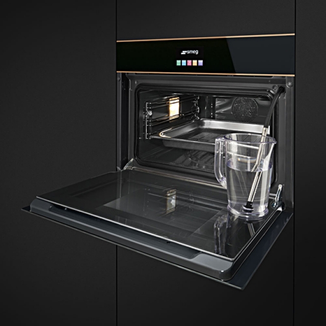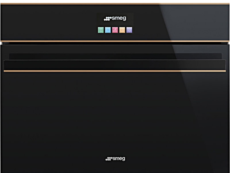 SMEG SF4604VCNR1 Einbau-Kompakt-Dampfbackofen, Schwarzglasfront, Profilleisten in Kupfer, Dolce Stil Novo - Design, Vapor Clean-Reinigungsfunktion, 12 Programmfunktionen, Sonderfunktion "Auftauen", Wassertankreinigung, EEK: A+