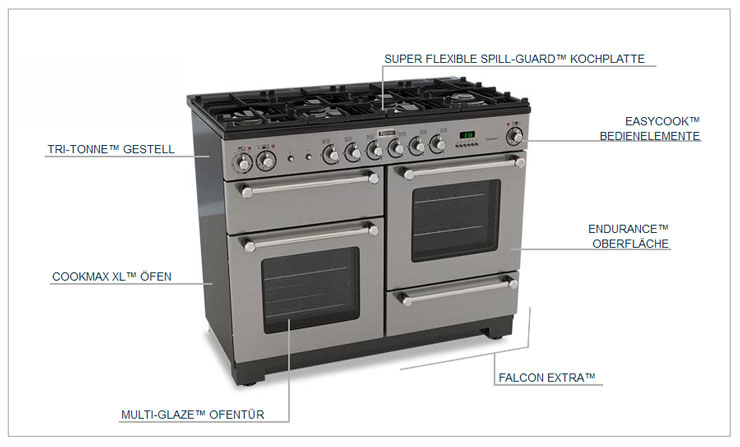 Mit einem Falcon wird jede Küche zum Mittelpunkt Ihres Zuhauses. Aufgrund des hohen technischen Standards gibt es auch mehr Range Cooker der Marke Falcon als von irgendeiner anderen Marke. Als Range-Cooker bezeichnet man grundsätzlich alle klassischen Herde die eine gewisse Auswahl von diversen Kochoptionen für unterschiedlichste Bereiche (Range) der Nahrungszubereitung aufweisen. Der Erfolg von Falcon-Herden basiert auf einer professionellen Entwicklungsarbeit gepaart mit einem jahrzehntelangen know-how, welche die Falconherde zum signifikanten Kochzentrum mit hoher Zuverlässigkeit gemacht haben. Neben einem aussergewöhnlichen Bedienkomfort zeichnen sich alle Falcon Herde durch langlebige Komponenten und ein sinnvolles Zubehör aus.
