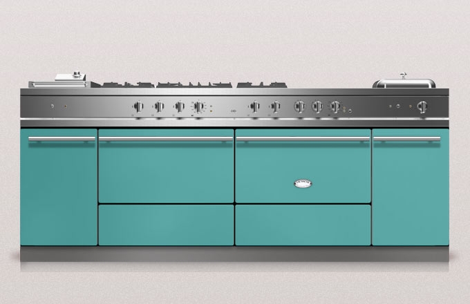 Lacanche Sully 2200 Modern, Rangecooker, Farbe Bleu Corail, 180,5 cm, individuelle Gestaltung von Kochfeldern, Gasbrennern, Backofen und Ausführung der Beschläge, mit 5 Jahren Garantie!