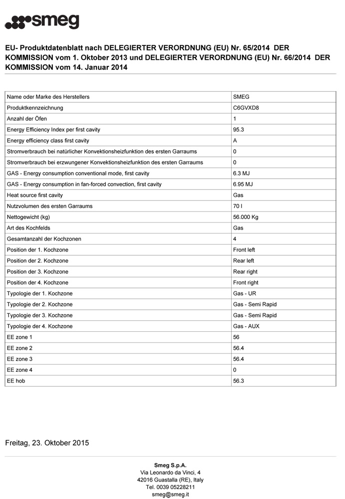 Technische Daten des Smeg Gasherds C 6 G V XD 8: