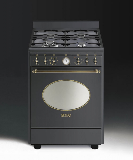 SMEG CO68GMAD 8 Kombistand-Herd, Anthrazit/Messing antik, 60 cm, Nostalgie-Design, Gaskochfeld mit 4 Kochzonen, 1 Backofen, 5 Backebenen, abnehmbare Backofentür, Ever-Clean-Funktion, Energieeffizienzklasse A