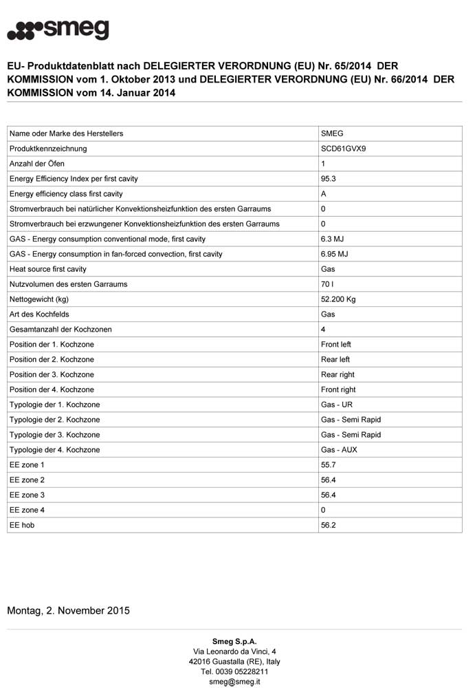 Technische Daten des Smeg S CD 61 GV X9 Gasherd: