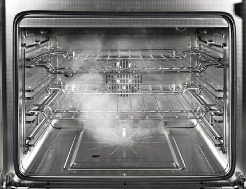 Elektronischer Ofen mit Kurzzeitwecker, Programmierung der Gar- und Backzeiten, mit dreifacher Verglasung für eine "kalte" Ofentüre und zusätzlicher Dampffunktion bei Ober- / Unterhitze für ein professionelles Garen und Backen.