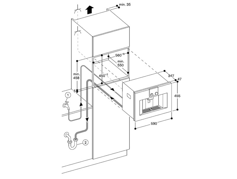 - Anschluss des Ablaufschlauchs an den Siphon (2) nicht direkt hinter dem Gerät positionieren und zugänglich halten