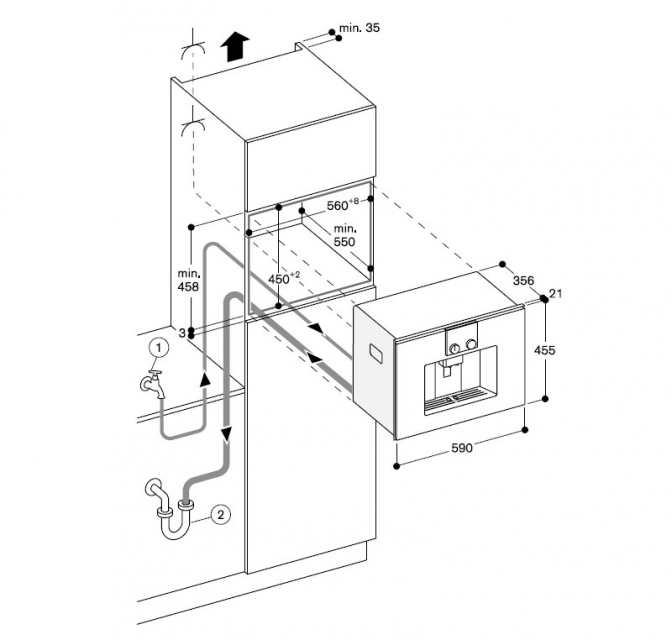 - Wasseranschluss (1) für Zulaufschlauch immer zugänglich halten; nicht direkt hinter dem Gerät positionieren.