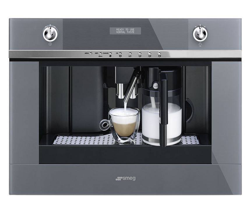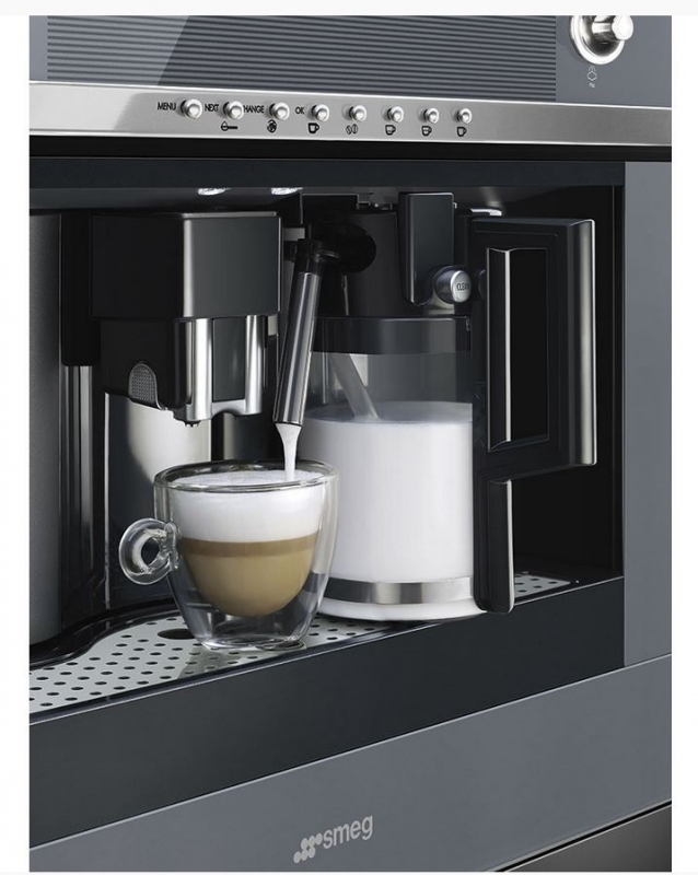 SMEG CMS4101S Einbau-Kompakt-Kaffeevollautomat, 45cm, Silberglas, Dampffunktion, Cappuccino - Milchschäumer