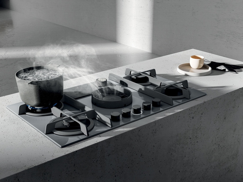 Elica Nikola Tesla Flame GR/F/88 Gas-Kochfeld mit integriertem Dunstabzug, graues Glas und Gusseisen, 88 cm, Umluftbetrieb, 3 Leistungsstufen + 2 I, Rotavio-Bedienung, PRF 0147743