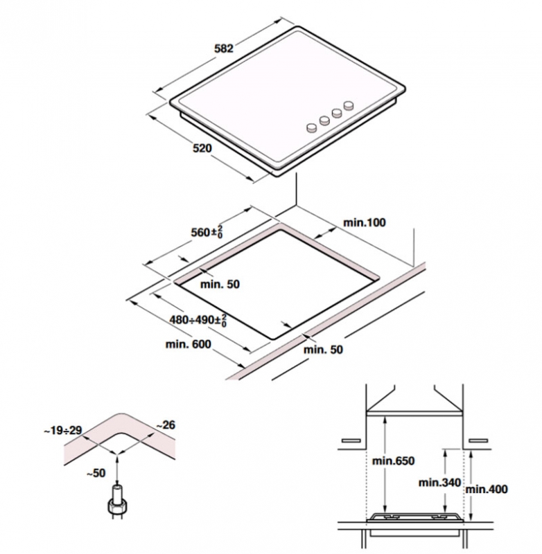 - Gasanschluss für Schubladentiefe berücksichtigen