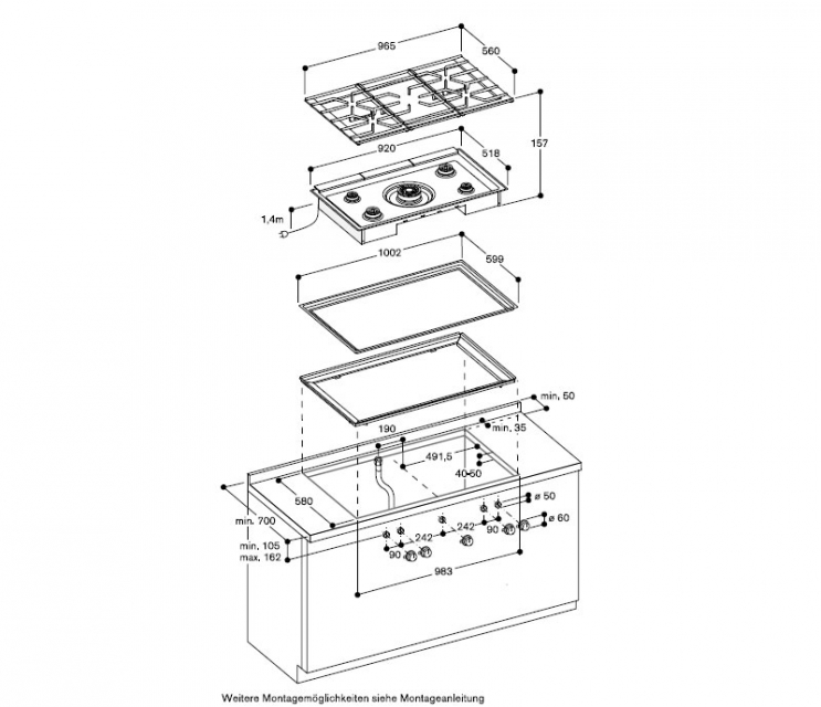 - Bei einer Gesamtleistung der installierten Gaskochfelder über 11 kW sind die örtlichen Vorschriften hinsichtlich Raumlüftung, Raumgröße und Kombination mit Dunstabzugshauben im Abluft- oder Umluftbetrieb zu beachten.