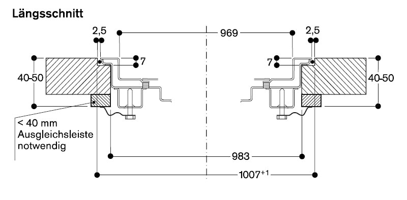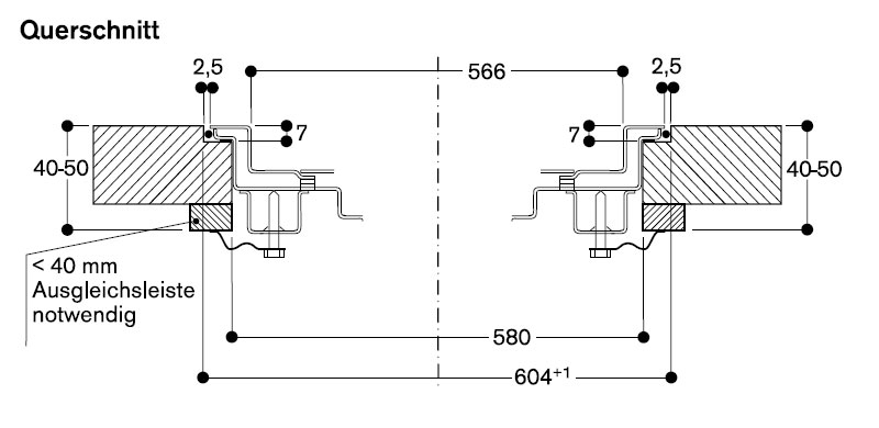 - Einbau in 85 cm breiten Ausschnitt oder in 88 cm breiten Ausschnitt unter Verwendung der mitgelieferten Distanzhalter.