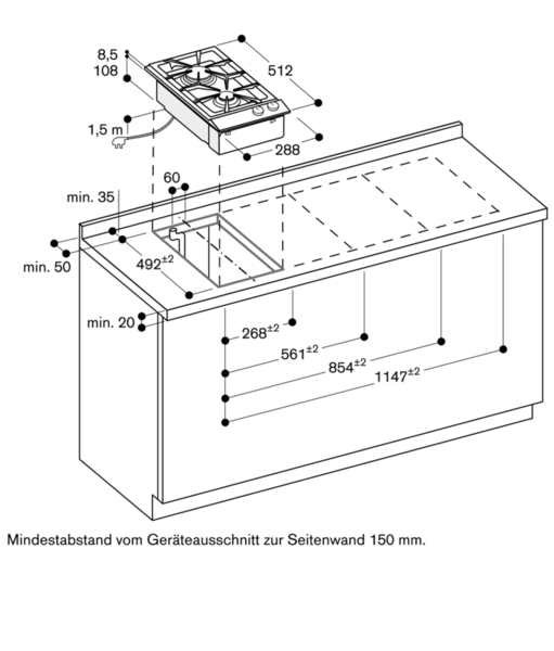- Seitlichen Abstand zu wärmeempfindlichen Möbelteilen oder Anstellflächen von mind. 150 mm beachten oder eine wärmedämmende Isolierung anbringen