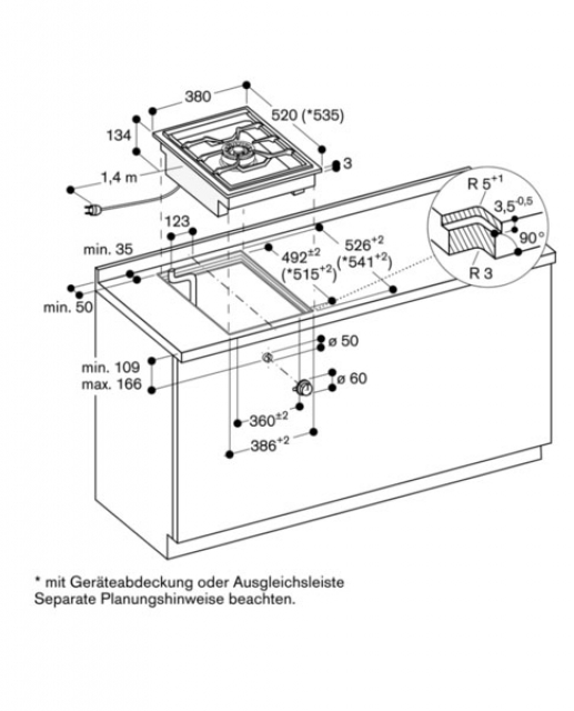 Das Montagesystem erfordert im Ausschnitt eine Seitenkantenhöhe von mind. 10 mm für aufgesetzten Einbau und von mind. 13 mm für flächenbündigen Einbau. Auf eine durchgängige Schnittfläche von 90° achten.