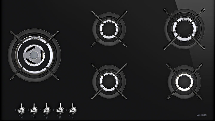 SMEG PV395LCNDE Gas-Kochfeld, Glaskeramik, Schwarz, 90cm, C-Schliff, Abstellroste und Wokring aus Gusseisen, 5 Kochzonen, mit 5 Jahren Garantie!