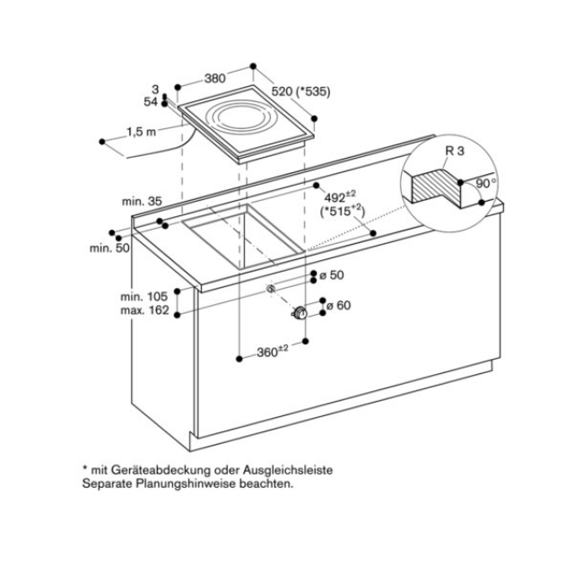 Das Montagesystem erfordert im Ausschnitt eine Seitenkantenhöhe von mind. 10 mm für aufgesetzten Einbau und von mind. 13 mm für flächenbündigen Einbau. Auf eine durchgängige Schnittfläche von 90° achten.