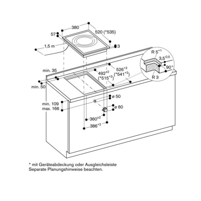 Die Tragfähigkeit und die Stabilität insbesondere bei dünnen Arbeitsplatten ist durch geeignete Unterkonstruktionen sicherzustellen. Gerätegewicht inkl. zusätzlicher Beladung berücksichtigen.