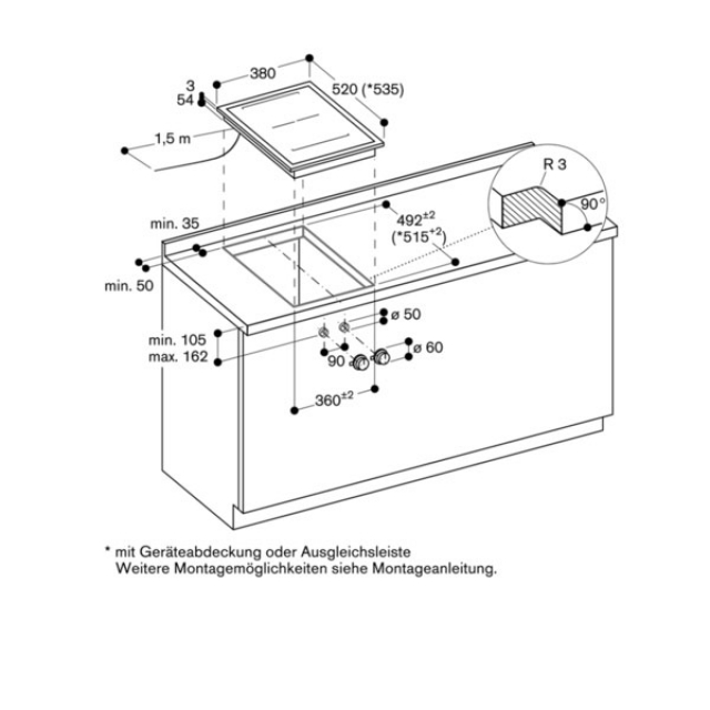 Das Montagesystem erfordert im Ausschnitt eine Seitenkantenhöhe von mind. 10 mm für aufgesetzten Einbau und von mind. 13 mm für flächenbündigen Einbau. Auf eine durchgängige Schnittfläche von 90° achten.