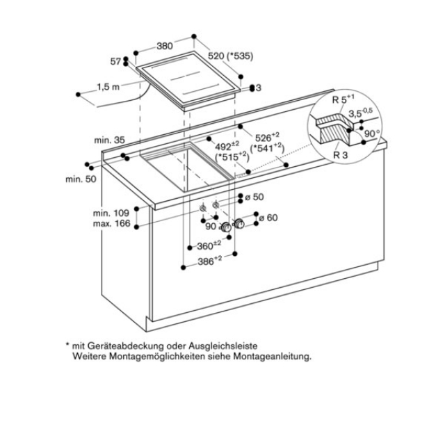 Die Tragfähigkeit und die Stabilität insbesondere bei dünnen Arbeitsplatten ist durch geeignete Unterkonstruktionen sicherzustellen. Gerätegewicht inkl. zusätzlicher Beladung berücksichtigen.