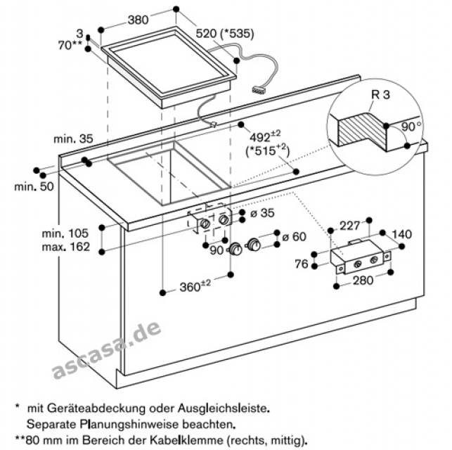 Hitzebeständigkeit und wasserdichte Versiegelung der Schnittkanten sind zu berücksichtigen. Bei anderen Materialien stimmen Sie sich bezüglich der Verwendung mit dem Arbeitsplatten-Hersteller ab