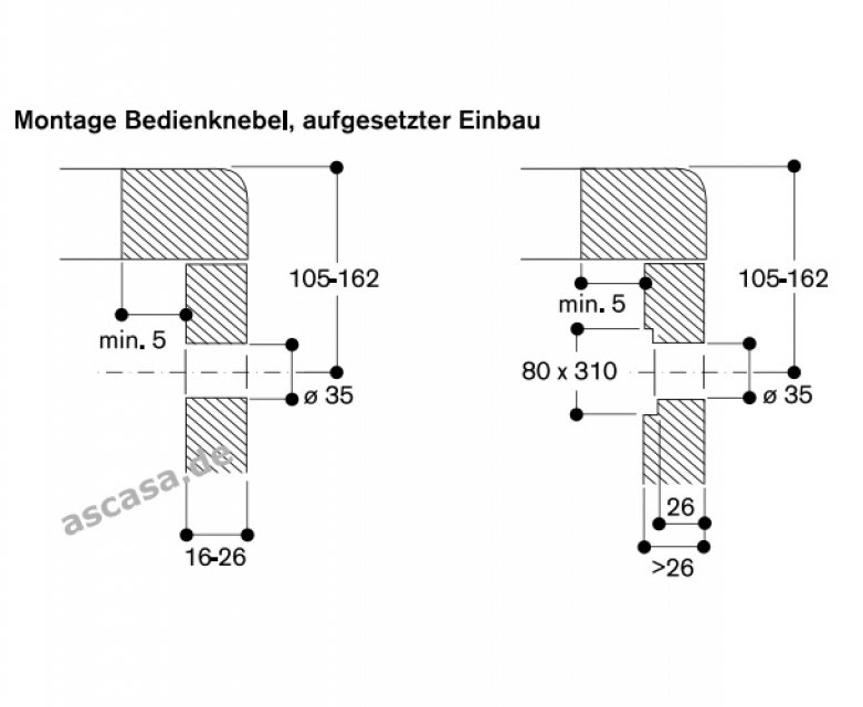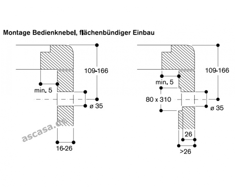 Wenn die Blendenstärke 26 mm überschreitet, muß die Skizze "Montage Bedienknebel" beachtet werden (muß hinten ausgespart werden)