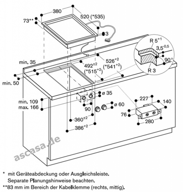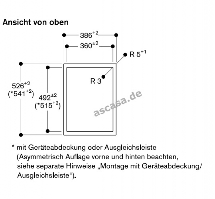 Zusätzliche Hinweise für flächenbündigen Einbau: Der Einbau eignet sich in Arbeitsplatten aus Stein, synthetischem Material oder Massivholz