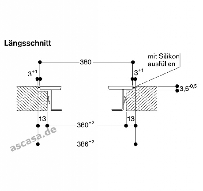 Das Montagesystem erfordert im Ausschnitt eine Seitenkantenhöhe von mind. 10 mm für aufgesetzten Einbau und von mind. 13 mm für flächenbündigen Einbau