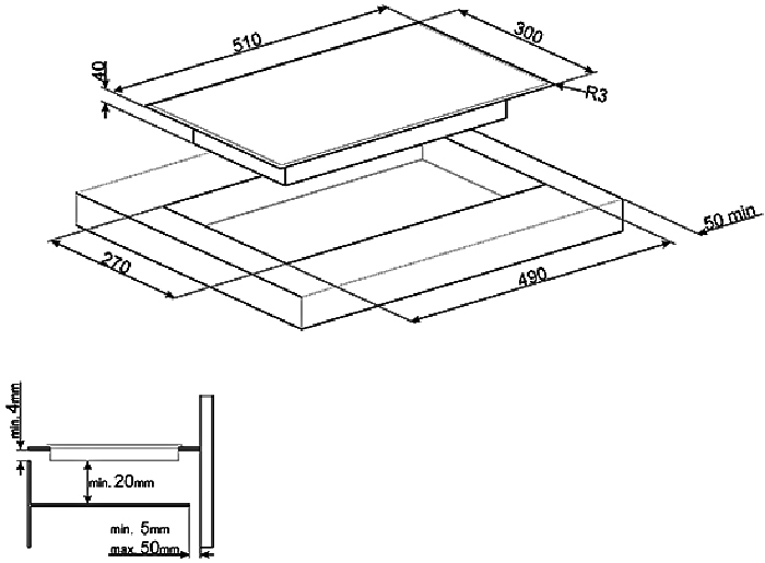 • H: Zweikreiskochzone rund Ø 124 mm / 148 mm, 0,7 kW / 1,7 kW