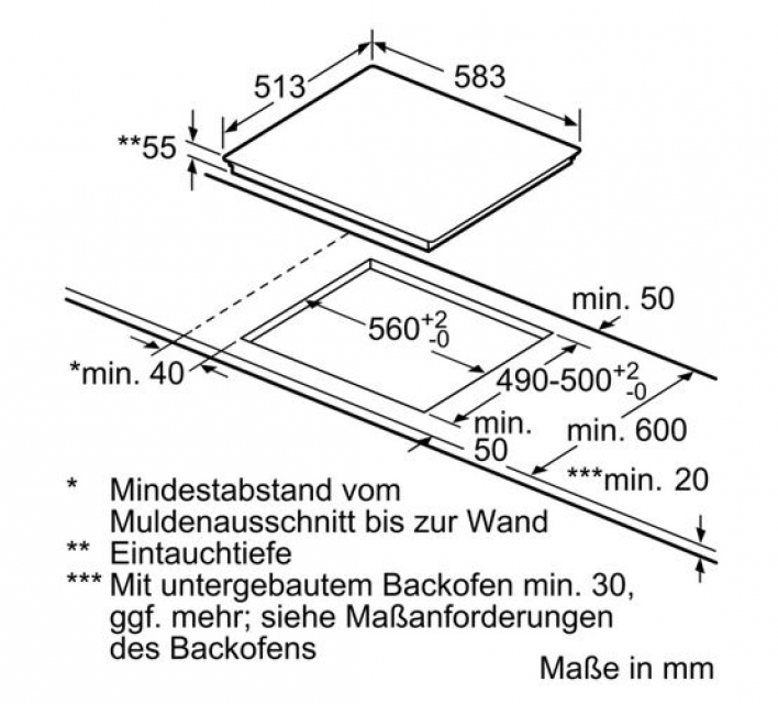 - Einbaumaße: (H/B/T) 55 x 560-560 x 490-500 mm - bitte beachten Sie bei diesem Gerät die Maßskizze
