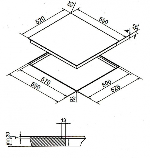 Ausschnittmaße aufliegend: 570mm x 500 mm