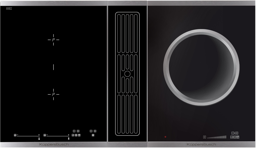 Das VarioLine-System von KÜPPERSBUSCH bringt die unterschiedlichsten Kochfeldgrößen mit dem Edelstahl-Rahmen harmonisch in Einklang.