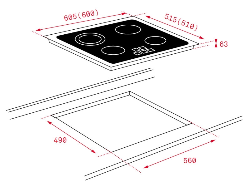 • Unter dem Kochfeld mind. 20 mm Freiraum lassen, um eine ausreichende Belüftung zu gewährleisten.