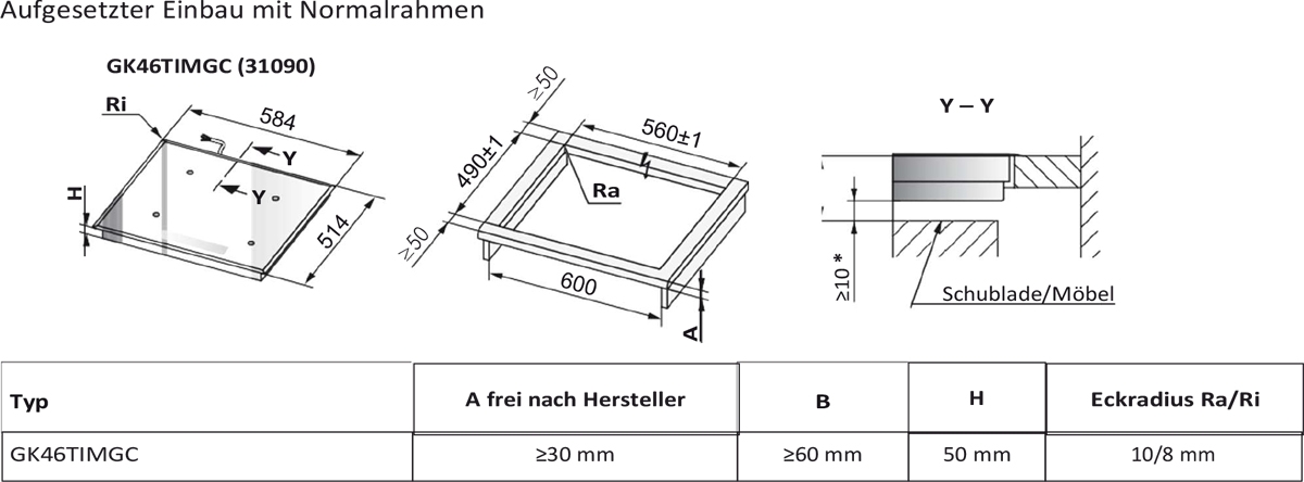 Ausschnitttiefe aufliegend max.: 490.0 mm