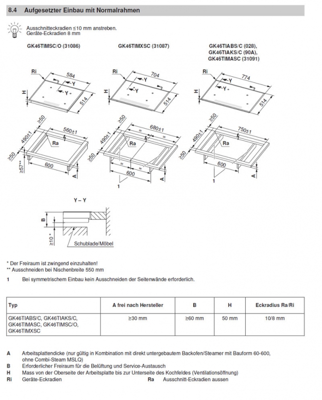 • Ausschnitttiefe aufliegend max.: 0.49 m