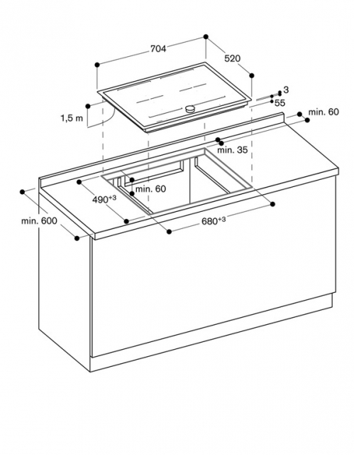 2 Flex-Induktionskochflächen 19x23 cm (2200 W, mit Booster 3700 W), zusammengeschaltet 38x23 cm (3300 W, mit Booster 3700 W)