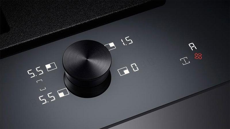 Die Handhabung eines klassischen Knebels wird hier mit modernster Technologie kombiniert: Auf einem digitalen Bedienfeld fungiert eine Art magnetischer Edelstahl-Puck als Bedienelement. Mit ihm können alle Kochzonen angesteuert und geregelt werden. Drehen Sie ihn nach rechts, erhöht sich die Temperatur der angewählten Zone, drehen Sie ihn nach links, sinkt sie ab. Der magnetische Knebel ist abnehmbar und kann unter fließendem Wasser gereinigt werden.