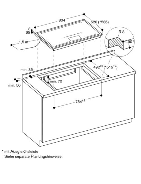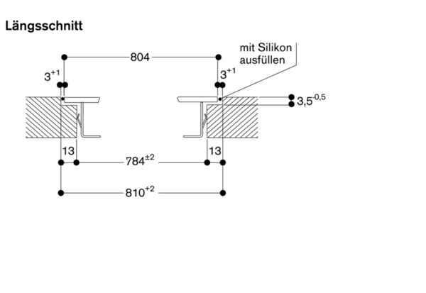 - Das Montagesystem erfordert im Ausschnitt eine Seitenkantenhöhe von mind. 10 mm für aufgesetzten Einbau und von mind. 13 mm für flächenbündigen Einbau.