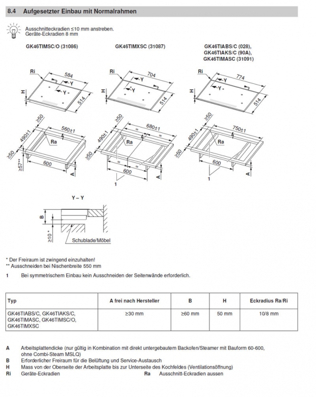 • Ausschnitttiefe aufliegend max.: 0.49 m