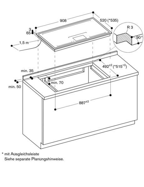 - Das Montagesystem erfordert im Ausschnitt eine Seitenkantenhöhe von mind. 10 mm für aufgesetzten Einbau und von mind. 13 mm für flächenbündigen Einbau.