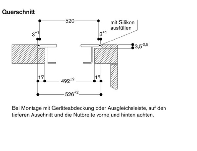 Die Nut muss durchgängig und eben sein, um eine gleichmäßige Auflage der Geräte auf der Dichtung zu gewährleisten. Keine punktuellen Unterfütterungen verwenden.