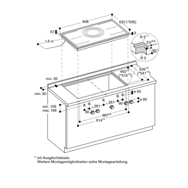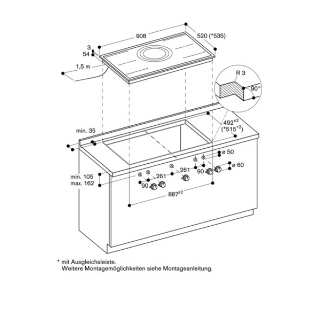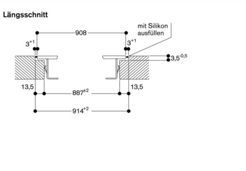 Das Montagesystem erfordert im Ausschnitt eine Seitenkantenhöhe von mind. 10 mm für aufgesetzten Einbau und von mind. 13 mm für flächenbündigen Einbau. Auf eine durchgängige Schnittfläche von 90° achten.