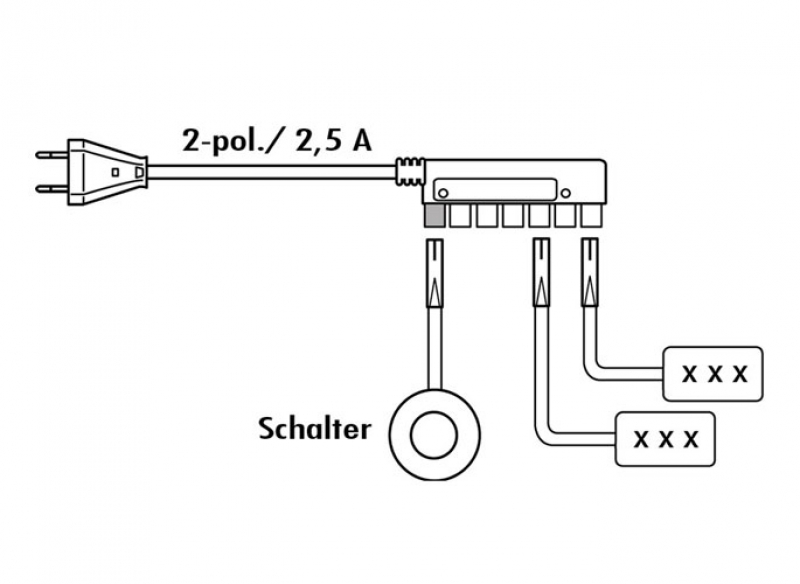 - mit codierter Steckerbuchse zum Anschluss von bis zu 6 Verbraucher u. 1 externen Schalter, 230 V, max. 2,5 A