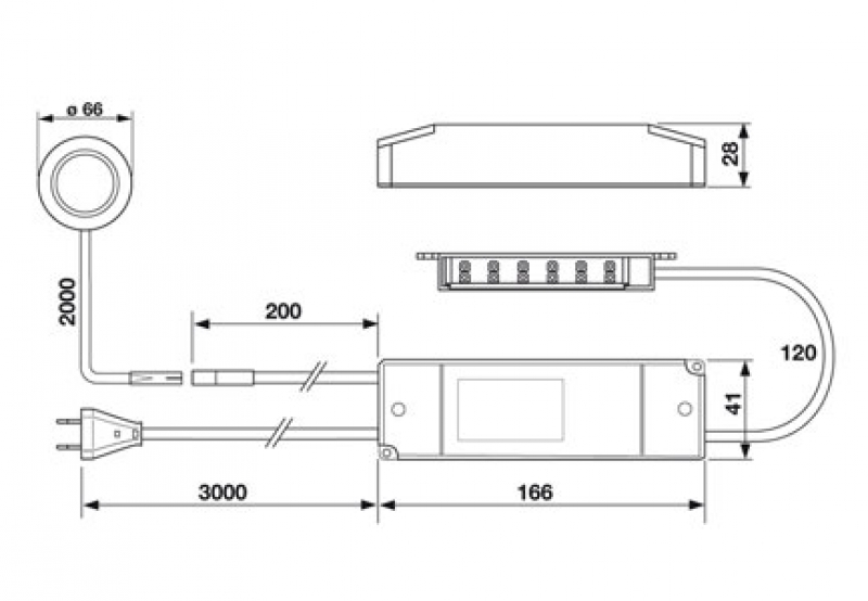 - 2000 mm Leitung zum Anschluss an Funktionsschalter (ein/aus/dimmen)